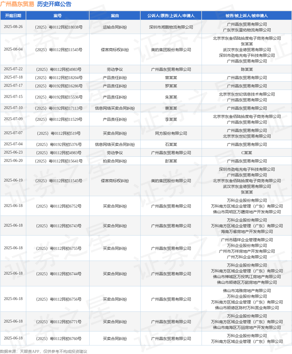 案号:(2025)粤0112民初4983号审理法院:广州市黄埔区人民法院案由:劳动争议当事人信息: 原告/上诉人:广州晶东贸易有限公司 被告/被上诉人:C某某开庭日期:2025年6月23日根据统计,近一年内以广州晶东贸易有限公司为当事人的历史开庭公告有140则,其中案由为“信息网络买卖合同纠纷”的公告以48则居首,其次为“买卖合同纠纷”有25则,“产品责任纠纷”有25则。历史开庭公告(前20条)如下: